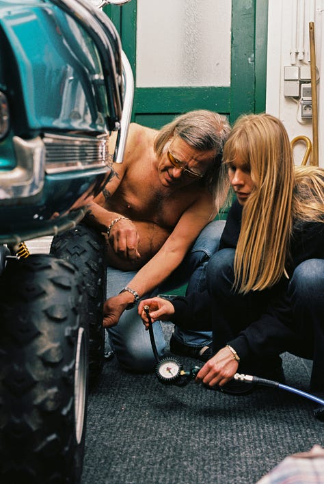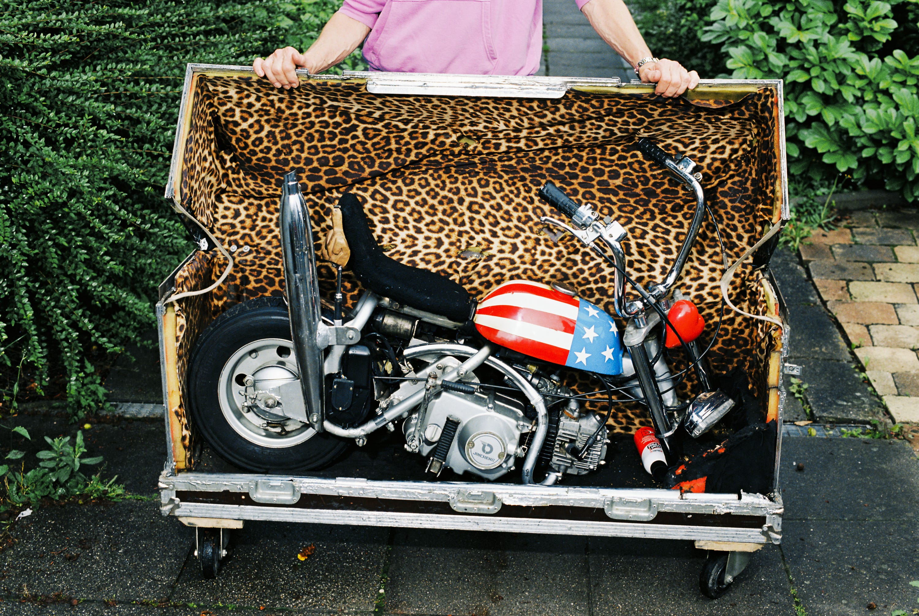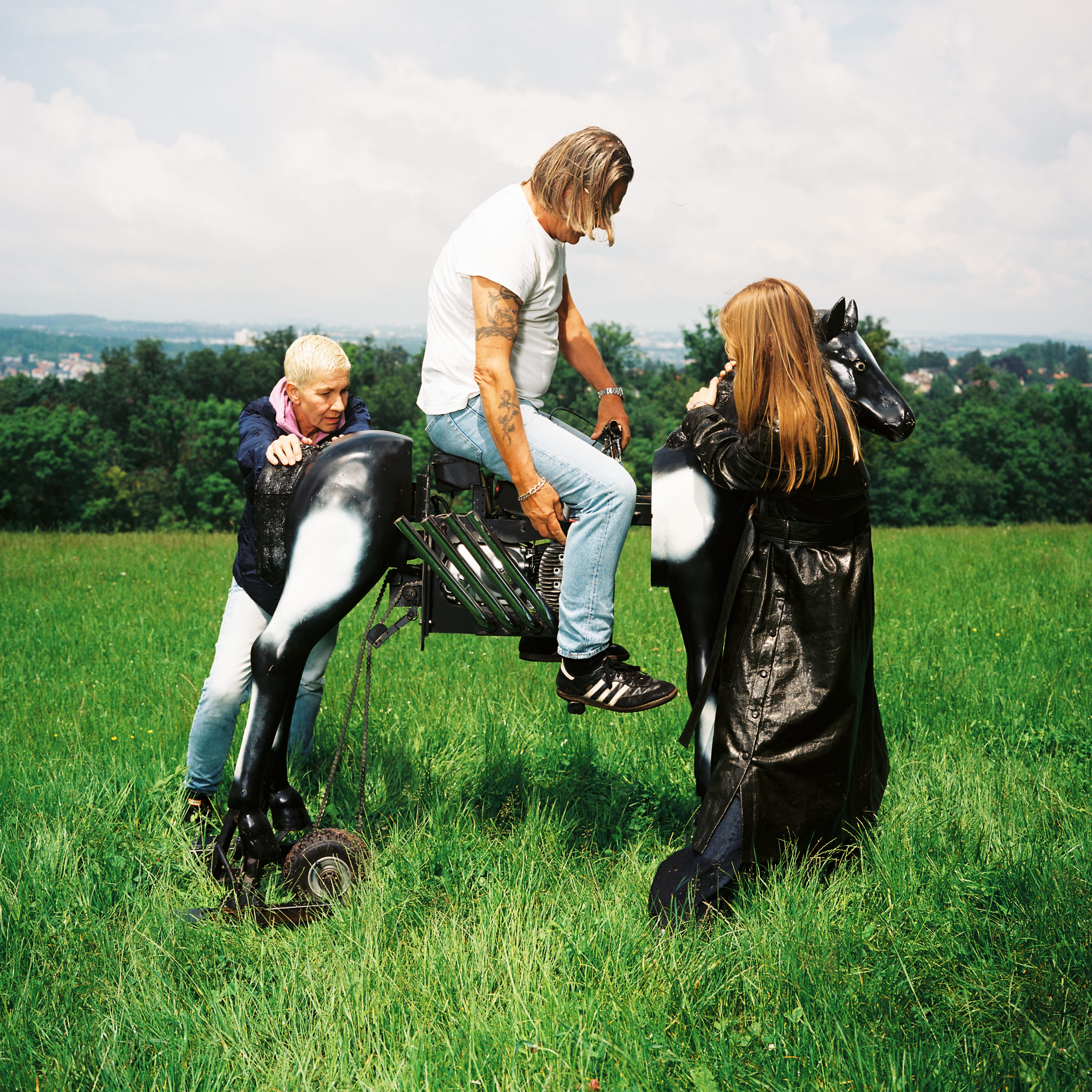 The project brings together the motorized constructions of German artist Michael Gaedt and the photographic works of Italian photographer Eric Scaggiante. For over forty years, Gaedt has been adding horsepower to unlikely objects, bumper cars, wheelbarrows, carousel horses, first in his Stuttgart garage and later on stage with his band Die Kleine Tierschau, performing more than 4,500 shows between 1981 and 2016. In the gallery, these engines are temporarily stilled and recontextualized as sculptural artifacts. Scaggiante’s images, shot in and around Gaedt’s studio, oscillate between documentation and surreal portraiture, capturing both the mechanical force and the childlike imagination that power them.